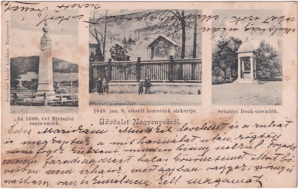 Fenichel Lázár kiadása, Nagyenyed / Az 1600. évi Miriszloi csata-emlék. / 1848. jan. 8. elesett honvédek sirkertje. / Sétatéri Deák-siremlék. / Üdvözlet Nagyenyedről