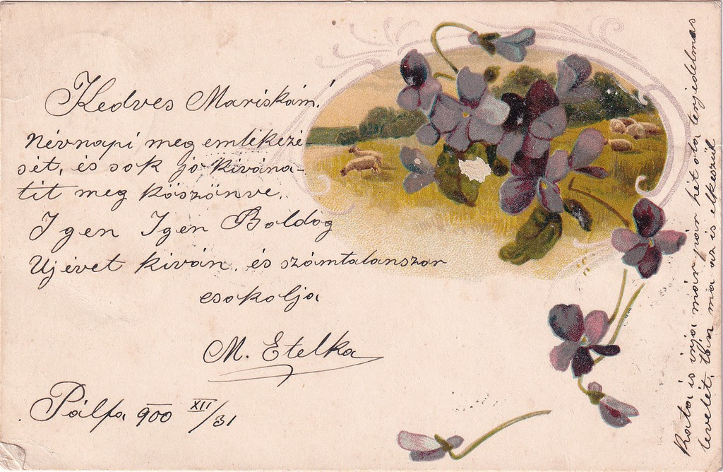 Kiss Sárika / nagys. úrleánynak / Lengyeltóti / /:Somogy vm.:/ / Kedves Sárikám! / Lapodat megkaptam, nagyon szépen köszönöm. Az utazásom nagyon körülményes lenne leírni, majd élöszóval. Az állomásnál vártak sokszor, de mikor jöttem, akkor nem. S nem is volt meglepetés a jövetelem, hiába akartam. Ma voltunk templomban és névrokonaidal találkoztunk, azt is Kiss Sárinak hívják a tanító úrnak a testvére. Hanem ami az írást illeti én, is elég csúnyán írok, majd úgy jársz, mint az összel nem igen tudod elolvasni. Ma megyünk Csepelyre, ha nem esik az eső. A Kiss néni kezeit csókolom. / Kiss bácsit is m. is üdvözlöm és a Józsikát is, téged sokszor csókol szeretettel: Irénke. / Ne gondold Sárikám, hogy én szigoruan bírálom az írástokat, külömben mindannyiótoknak boldog és kellemes ünnepeket kíván szeretettel Mariska.