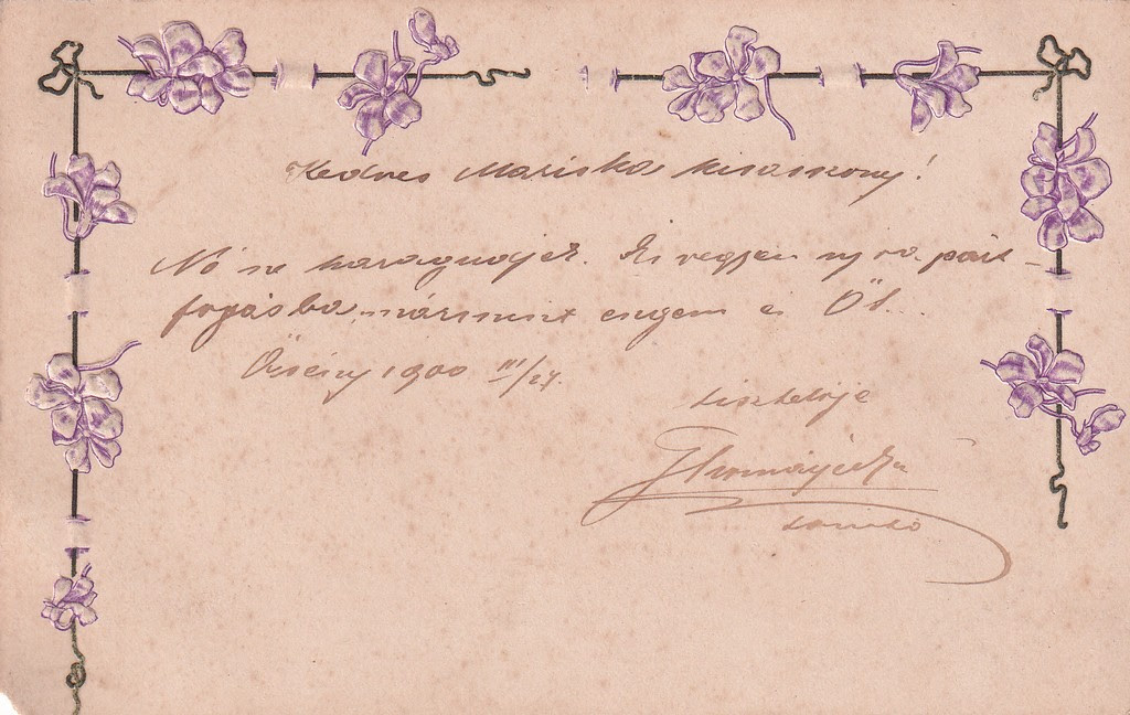 Pálfa 900 IV/8 /Kedves Mariskám !!!/ A haragra nincs semmi okom de hogy is írhat olyant, csak igen el vagyok foglalva, de azért amint időm engedi írni fogok én is levelet. ibolyázni még mi sem voltunk.- csokolja sokszor [sz. b.] Katus / [Övéinél] üdvözletem kérem átadni – Víg Husvéti innepeket kívánok!