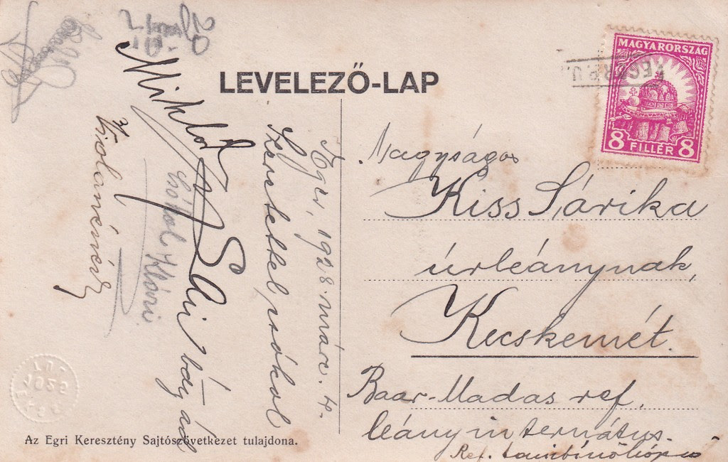 Nagyságos / Kiss Sárika úrleánynak / Kecskemét. / Baar-Madas ref. / leányinternátus. / Ref. tanitónőképző/ Eger, 1928. márc. 4. / Szeretettel csókol / bátyád. / Csókol Klári / Violanénéd / Miklós, Saul [?] bátyád / [?]/ [?]