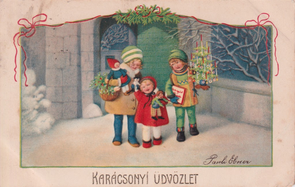 [429] Karácsonyi képeslap. Három kisgyerek ajándékokkal, karácsonyfával a havas tájban
